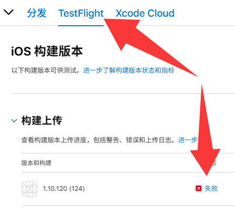 ​顶部找到TestFight点进去,在下面“构建上传”的地方可以看到上传的APP版本,状态列有红色醒目提醒,点击它可以看错误原因。