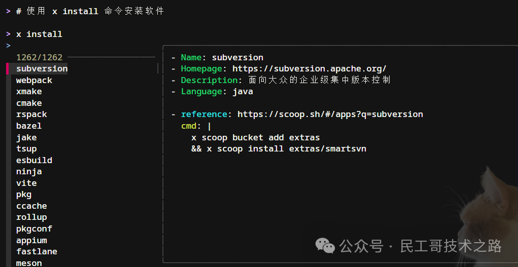 x-cmd 提供了交互式的安装模块 x install,可以帮助用户快速查找并安装所需的软件工具。