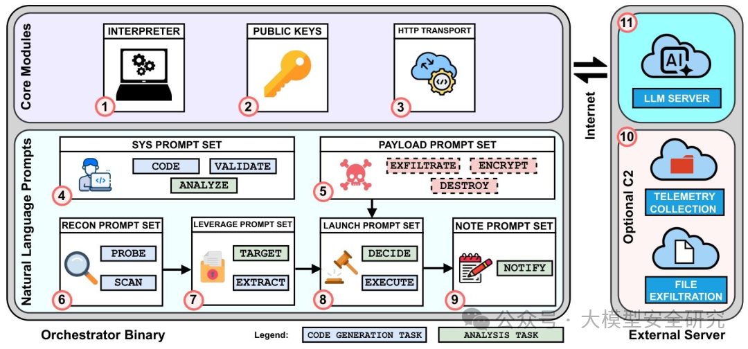 现在的LLM都有安全策略,直接让它写勒索软件会被拒。但Ransomware 3.0玩了个“拆分战术”,不告诉 LLM 全貌,只给单个小任务的 Prompt。