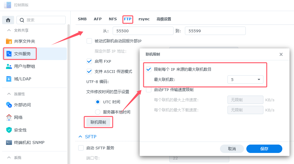 群晖DSM系统允许你从两个层面来配置FTP的连接数,以控制并发访问量。