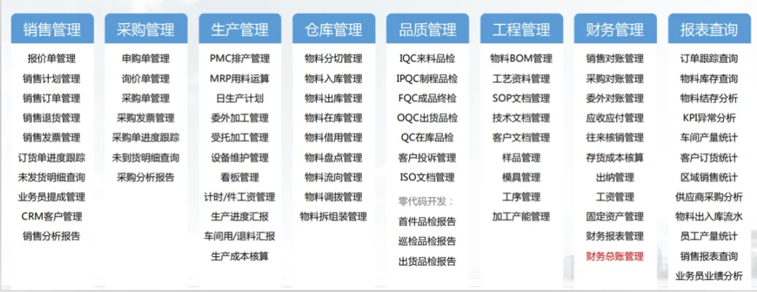 采购管理:申购单 / 询价单 / 采购单,物料缺货报告 / 采购单跟踪,采购发票管理 / 采购分析报告;