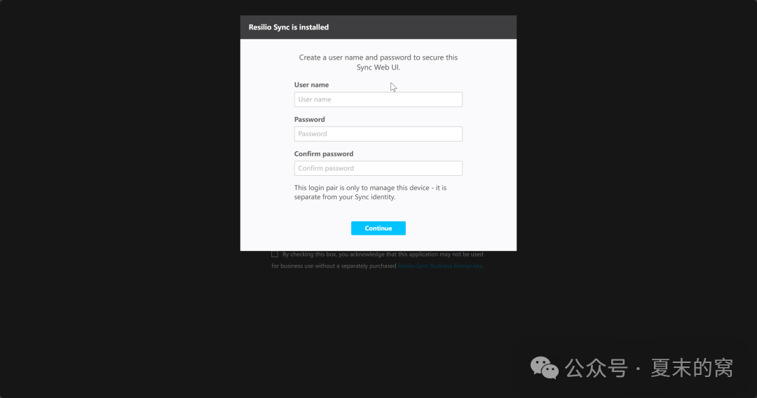 首次打开页面,弹出下图,大致意思是让你设置账号密码,第一行输入账号名,第二三行输入密码。最后点击按钮“Continue”确认。