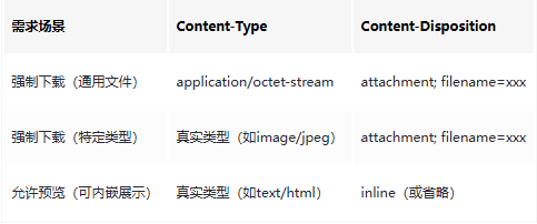 attachment:强制下载,可搭配filename指定文件名(如filename="合同.pdf");