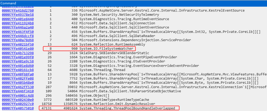 为了找出原因,上 windbg 附加,使用 !dumpheap -stat 观察托管堆,截图如下: