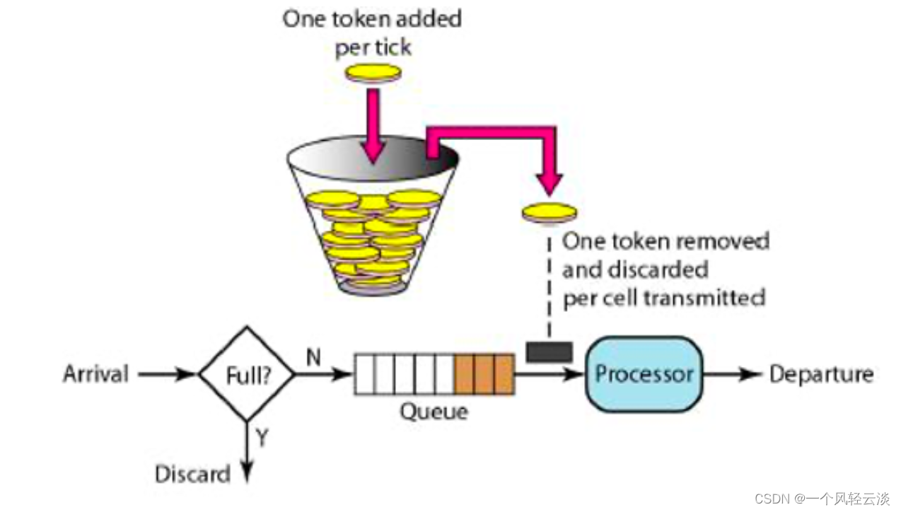 2. 当令牌桶满时,再来的令牌会被丢弃。