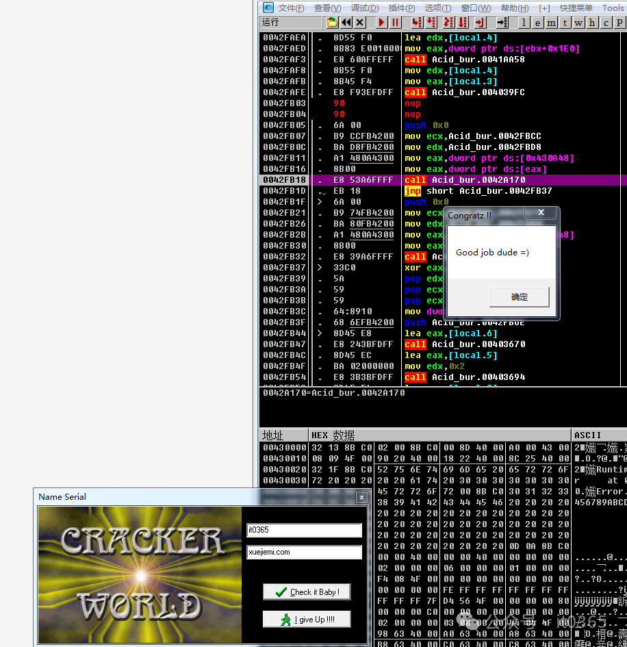 反汇编软件功能介绍可以看它的文档或网上有很多文章,这里不废话。我们主要看的几个窗口说下。 A区域:反汇编面板窗口 (分为4列从左至右依次是Address,Hex dump,Disassembly,Comment) Address(地址):显示被双击行的相对地址,再次双击返回便准地址模式; Hex dump(十六进制机器码):设置或取消无条件断点,对应的快捷键是F2; Disassembly(反汇编代码):调用汇编器,可直接修改汇编代码,对应快捷键是空格。 Comment(注释):允许增加或编辑注释,对应的快捷键是";"; 从键盘上选取多行,可按Shift和上下光标键(PgUp/PgDn),可以使用右键快捷菜单,可以按Ctrl键并按上下光标,可逐行滚动汇编窗口。(数据与代码混合时异常有用) B区域:寄存器面板窗口 显示CPU各寄存器的值,支持浮点,MMX,3DNow!寄存器。可以右键或窗口标题切换显示寄存器的方式。 C区域:数据面板窗口 以十六进制和字符方式显示文件在内存中的数据,要显示制定内存地址的数据,可单击右键快捷菜单中的“Go to expression”命令或者按Ctrl+G快捷键,打开地址窗口输入地址。 D区域:栈面板窗口 显示栈的内容,即ESP指向地址的内容。将数据放入栈的称为入栈(push),从栈中取出数据的操作称为出栈(pop)。API函数和子程序都利用它传递参数和变量。 说完OD后,我们用OD启动要破解的软件后,随便输入错的注册码,看看有什么提示
