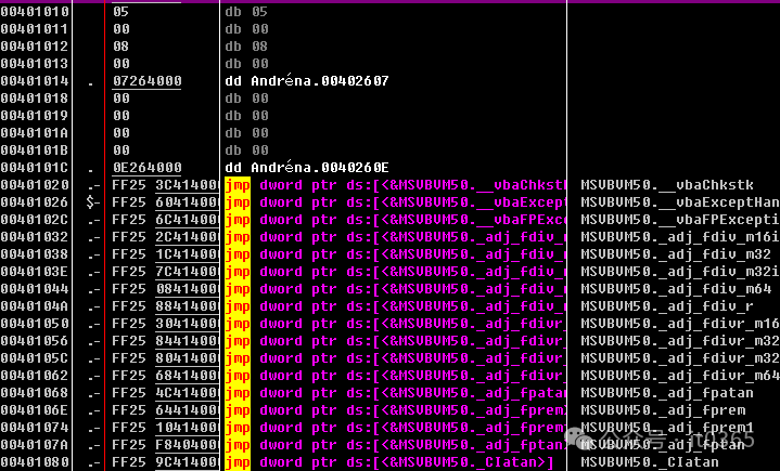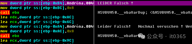00402206   .  8B1D A0414000 mov ebx,dword ptr ds:[<&MSVBVM50.__vbaMidStmtVar>;  MSVBVM50.__vbaMidStmtVar0040220C   .  8D4D CC       lea ecx,dword ptr ss:[ebp-0x34]0040220F   .  51            push ecx00402210   .  604         push 0x400402212   .  8D95 54FFFFFF lea edx,dword ptr ss:[ebp-0xAC]00402218   .  601         push 0x10040221A   .  52            push edx0040221B   .  C785 5CFFFFFF>mov dword ptr ss:[ebp-0xA4],Andréna.00401C34     ;  -00402225   .  C785 54FFFFFF>mov dword ptr ss:[ebp-0xAC],0x80040222F   .  FFD3          call ebx                                         ;  MSVBVM50.__vbaMidStmtVar; <&MSVBVM50.__vbaMidStmtVar>00402231   .  8D45 CC       lea eax,dword ptr ss:[ebp-0x34]00402234   .  8D8D 54FFFFFF lea ecx,dword ptr ss:[ebp-0xAC]0040223A   .  50            push eax0040223B   .  609         push 0x90040223D   .  601         push 0x10040223F   .  51            push ecx00402240   .  C785 5CFFFFFF>mov dword ptr ss:[ebp-0xA4],Andréna.00401C34     ;  -0040224A   .  C785 54FFFFFF>mov dword ptr ss:[ebp-0xAC],0x800402254   .  FFD3          call ebx                                         ;  MSVBVM50.__vbaMidStmtVar