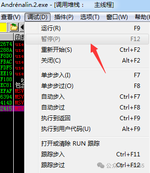 F9运行软件后,输入假用户名与注册码,按下调试器上的暂停(F12)