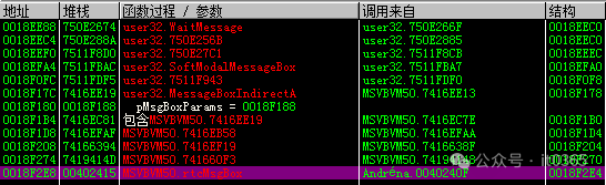 看到API内部有个CALL压入了我们需要的值在堆栈窗口看到