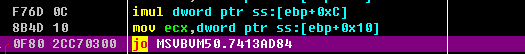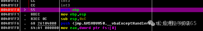 004021D6   > \8D4D CC       lea ecx,dword ptr ss:[ebp-0x34]004021D9   .  8D95 54FFFFFF lea edx,dword ptr ss:[ebp-0xAC]004021DF   .  51            push ecx                                 ; /var18 = 0018F404004021E0   .  8D45 94       lea eax,dword ptr ss:[ebp-0x6C]          ; |004021E3   .  52            push edx                                 ; |var28 = 0018F38C004021E4   .  50            push eax                                 ; |SaveTo8 = 0018F3CC004021E5   .  C785 5CFFFFFF>mov dword ptr ss:[ebp-0xA4],0x499602D2   ; |004021EF   .  C785 54FFFFFF>mov dword ptr ss:[ebp-0xAC],0x3          ; |004021F9   .  FF15 5C414000 call dword ptr ds:[<&MSVBVM50.__vbaVarMu>; \__vbaVarMul