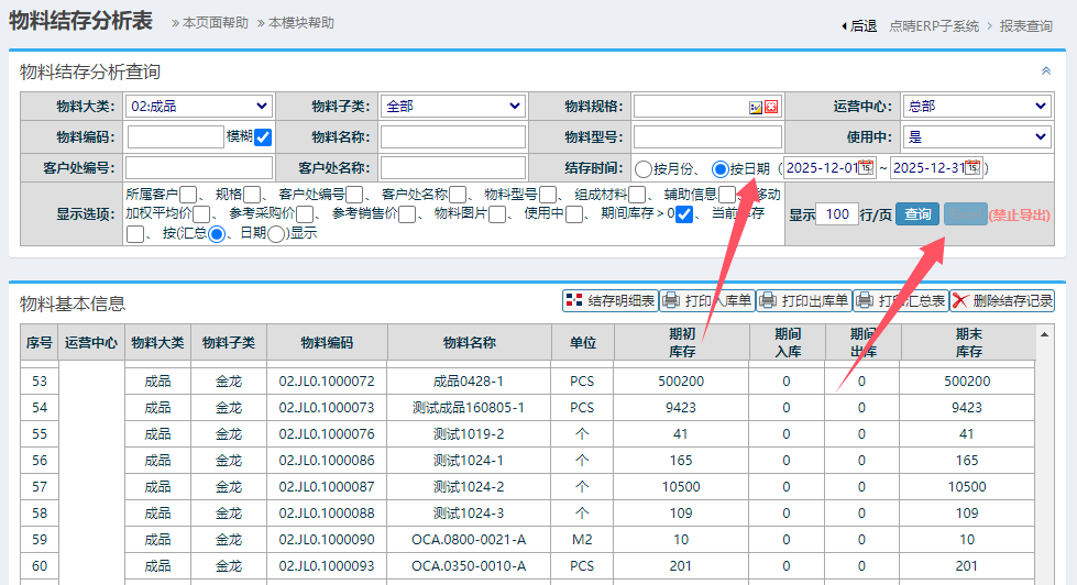 :点晴模切ERP系统中的仓库物料历史库存明细信息在哪里查看? 点晴ERP系统中支持按照月份和时间范围来查看物料历史库存,查看位置:报表查询-》物料结存分析表