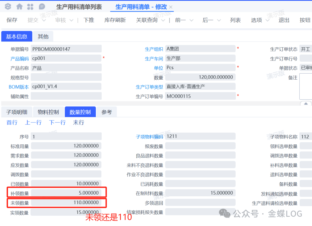 ①生产领料单发的是计划内的需求,也就是用料清单的应发数量;领料单在审核之后会反写用料清单的【已领数量】字段,并且会扣减【未领数量】字段