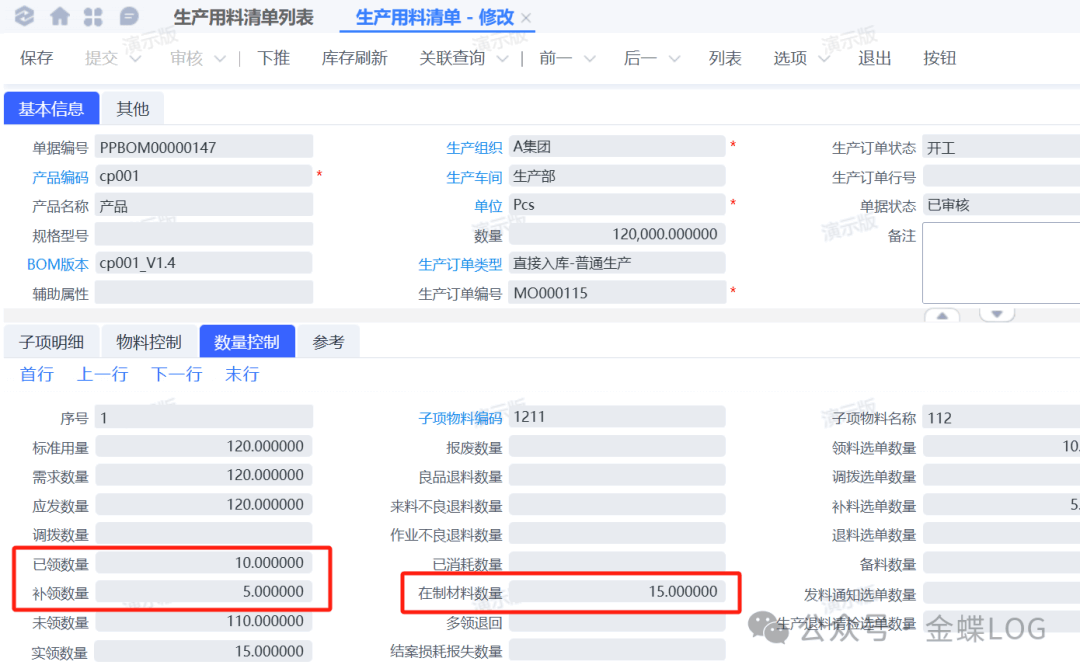 但是这两个单据都会增加用料清单的【在制材料数量】,也就是说你需求是100个,生产领料单领了90个,生产补料单补了10个;也是能够入库100个的产品。