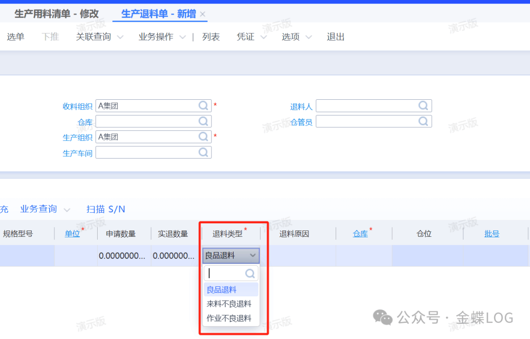 ③在生产退料之后,是做领料单还是补料单也有区分。主要看退料单上的【退料类型】选的是什么
