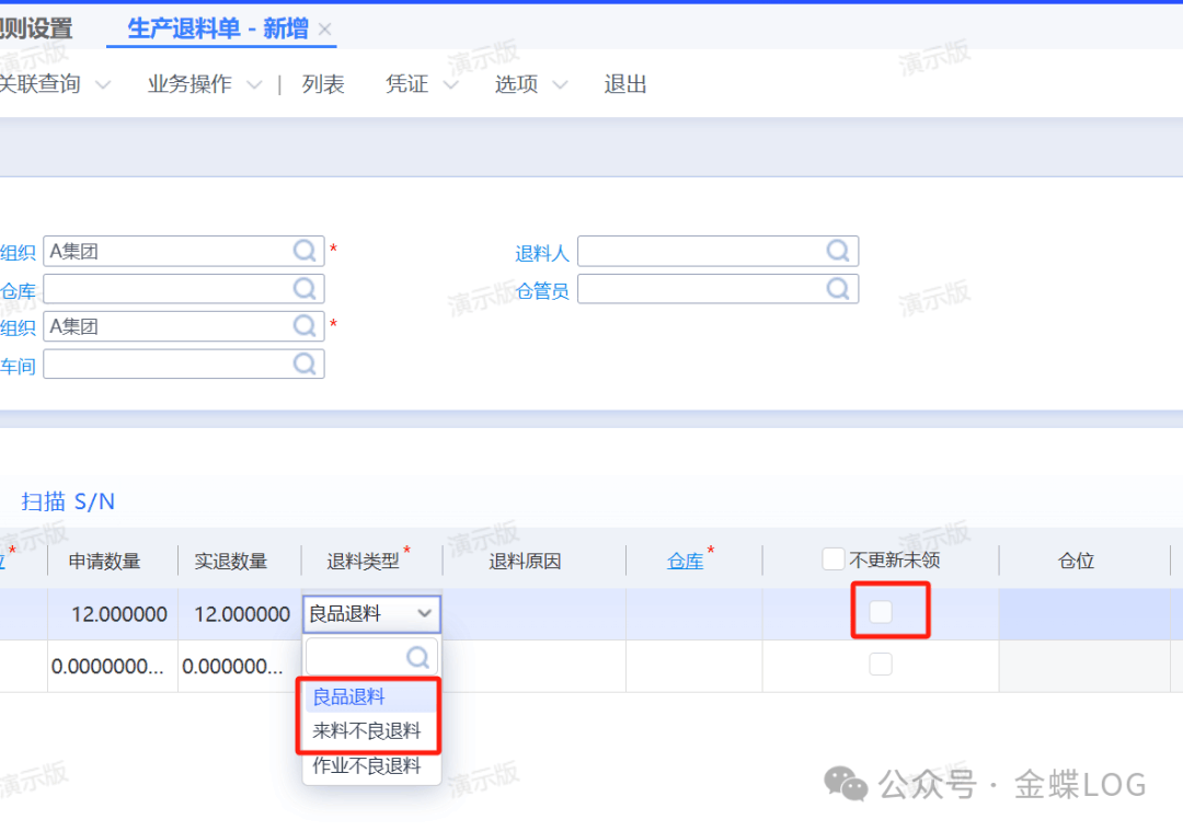 如果选的是【良品退料】和【来料不良退料】,会扣减生产用料清单的【未领数量】(前提是没有勾选【不更新未领】),这时需要通过生产领料单再次出料;