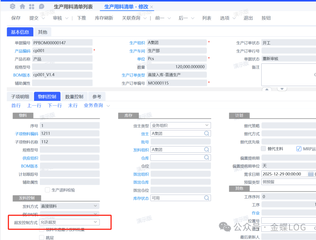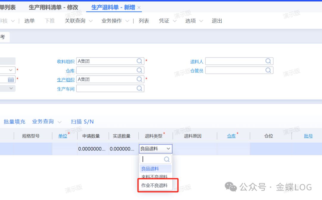 如果【作业不良退料】你也要走生产领料单,那生产用料清单超发控制方式只能是选择【允许超发】。因为生产领料单发的是需求内的,作业不良一般是产线导致的损耗,正常走的是补料单。