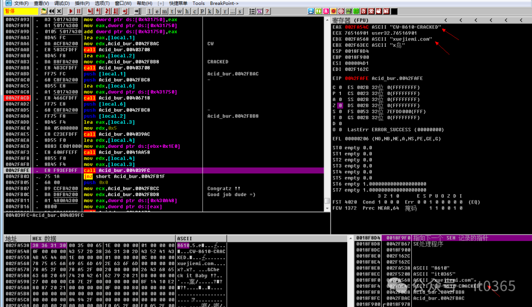 上一篇学习了破解软件,强制实现注册:跟我这样做帮你快速零基础入门软件逆向与破解01这篇来学习下真实注册码的实现算法,接上篇我们对关键跳转位置进行了NOP后,软件随便输入内容都提示注册成功。仔细观察发现JNE是一个条件跳转,它的上一条语句是一个CALL,其实它就是一个函数,用真注册码和假注册码进行对比,如果不相等就会跳...