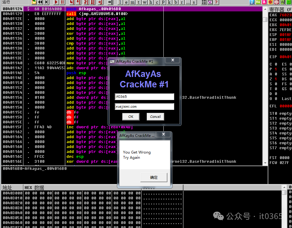 软件逆向破解零基础入门实战第四篇,继续分析一个软件的注册部分和注册机算法逆向。同样打开OllyDBG.EXE,将要反汇编的软件拖进OD内,F9运行,先试用软件功能。尝试输入错误的用户名和密码,就报错了。使用最直接的方式,搜索内存字符串。点击OD上面菜单的M按钮,选择程序TEXT段,右键反汇编在反汇编窗口右键选择字符串搜...