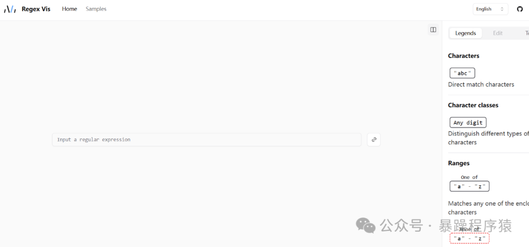 简介regex-vis是一款的正则表达式可视化工具,提供了一系列组件,让你可在Web页面上通过配置,快速生成正则表达式,以及对应的可视化图形,并且还支持运行测试,检验结果。主要功能可视化展示将复杂的正则表达式转换为直观的图形化表示,包括字符类、量词(如*、+、?)、分组(捕获组/非捕获组)、锚点(^、$)、选择分支(r...