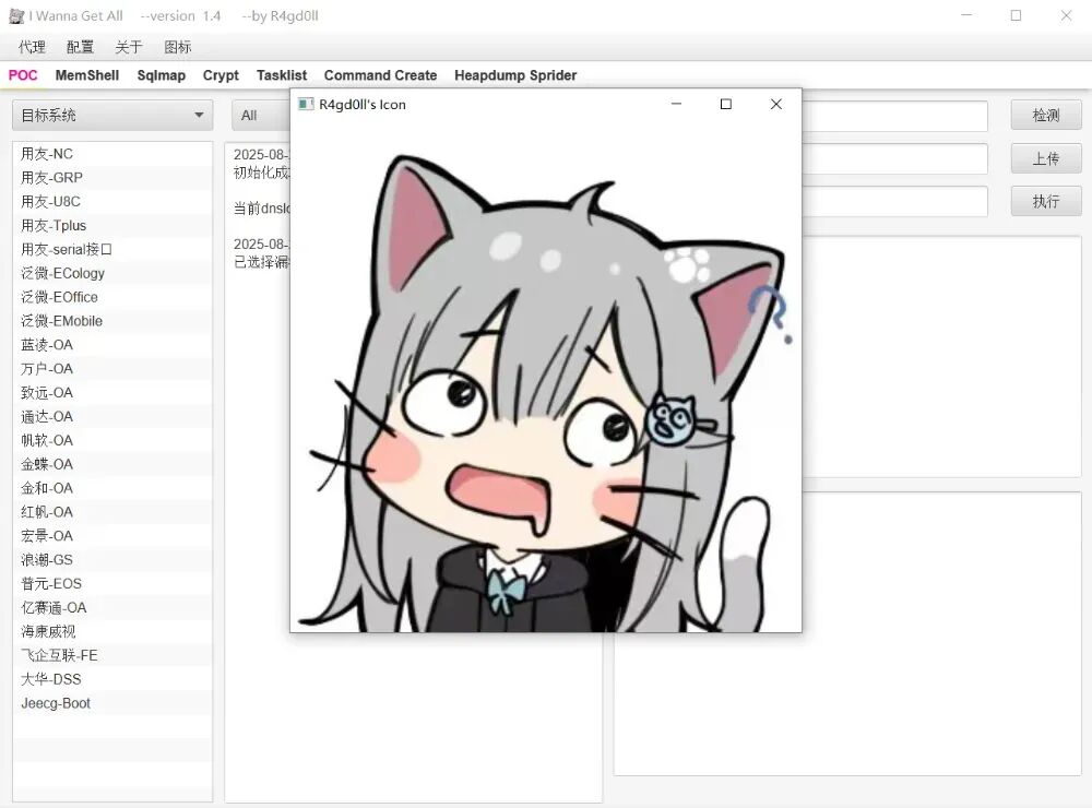 I-Wanna-Get-All简介集成漏洞系统包括:用友、泛微、蓝凌、万户、致远、通达、帆软、金蝶、金和、红帆、宏景、浪潮、普元、亿赛通、海康威视、飞企互联、大华DSS、jeecg-boot集成memshell功能:用友NC、用友U8C、亿赛通、帆软通道、jeecgboot注入内存马。目前集成385漏洞,包括nday、...