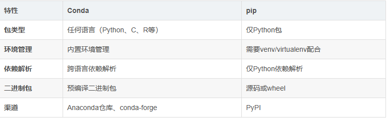 Conda和pip都是Python包管理工具,但它们在设计理念、功能和使用场景上有显著区别。以下是详细的对比: 核心区别概览 详细区别分析1.包管理范围Conda: #可以安装任何语言的包condainstallpythonnumpy#Python包condainstallr-baser-ggplot2#R语...