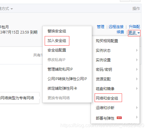 4、在服务器实例–>更多–>网络和安全组–>加入安全组,选择新建的安全组规则: