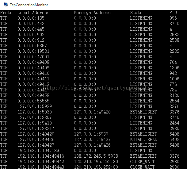 22. TcpConnectionTableHelper.MIB_TCPROW_OWNER_PID[] tcpProgressInfoTable = TcpConnectionTableHelper.GetAllTcpConnections();