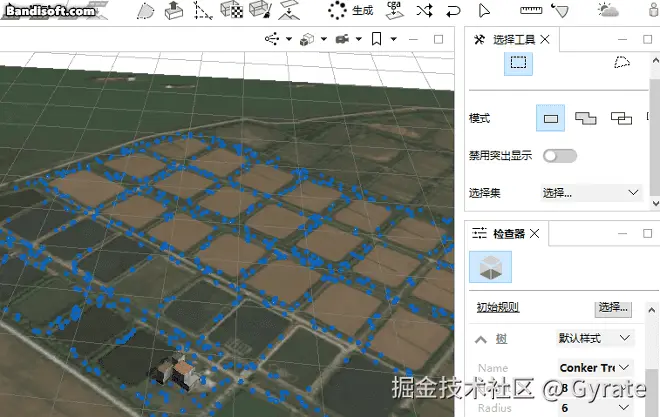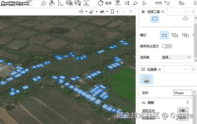 村居是指农业示范区内的建筑面生成模型,绿化图层则是绿树等植物的覆盖区域,原本应该是两个图层,因为在本场景中仅仅作为地图三维底座,均无交互性,我就直接把它们合并为一个3Dtiles以提升性能了。