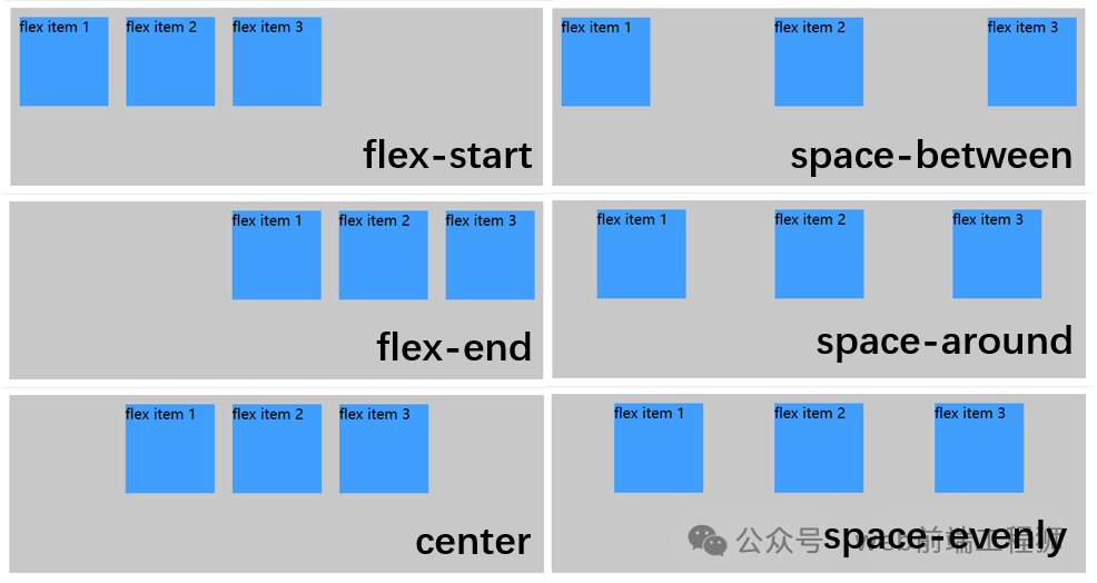 justify-content: flex-start | flex-end | center | space-between | space-around | space-evenly;