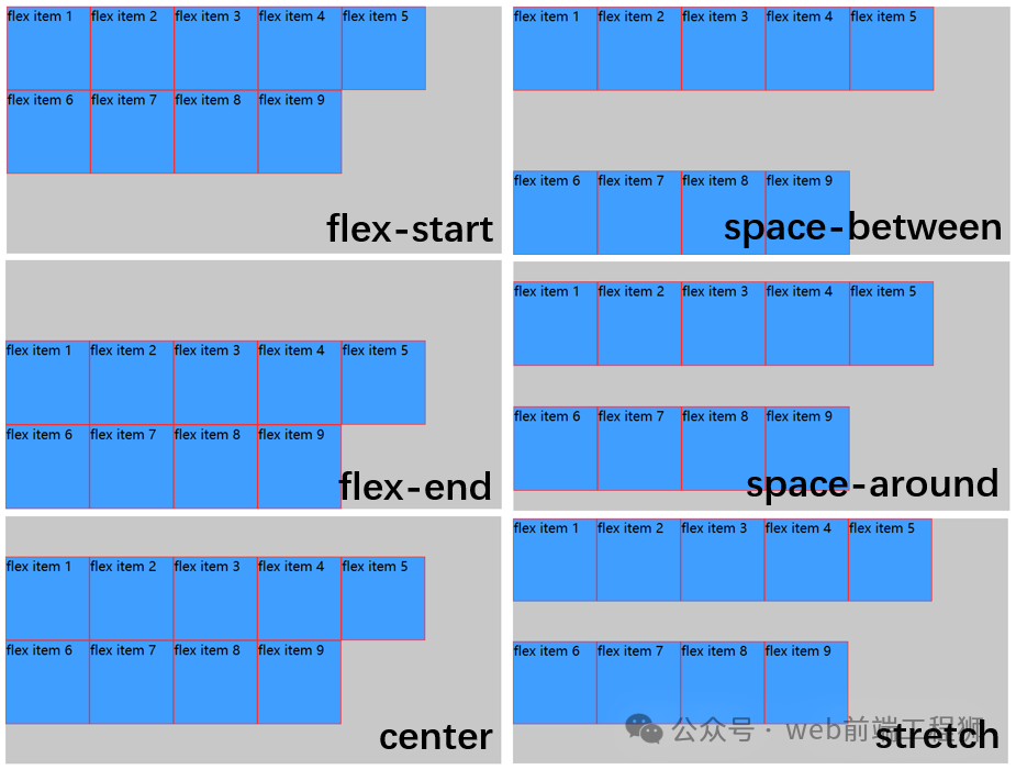 • 生效条件:容器有多行项目(需设置 flex-wrap: wrap