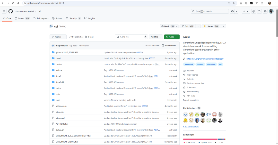 CEF拥有活跃的开发者社区,GitHub仓库累计获得12.3k Star和3.1k Fork。官方维护者定期同步Chromium主线版本,确保框架安全性与功能迭代。此外,衍生项目如: