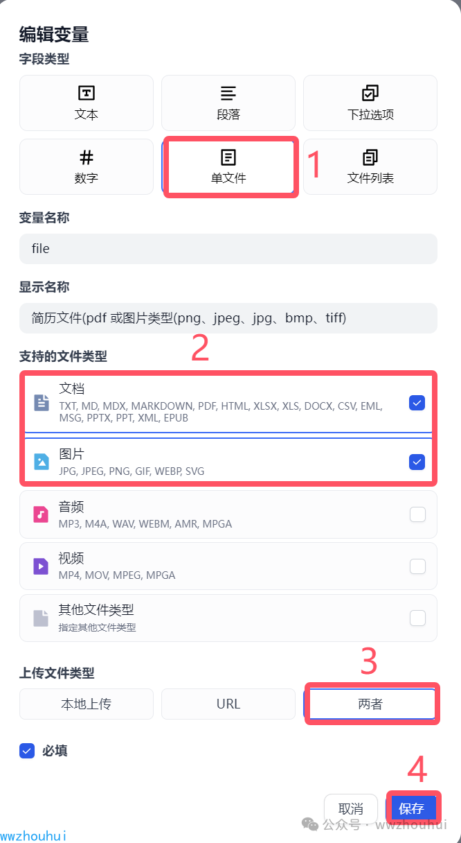 这个开始节点有一个参数就是文件上传,我们这里选择单个文件,文件类型选择文档和图片