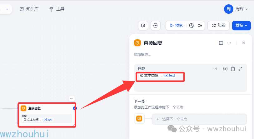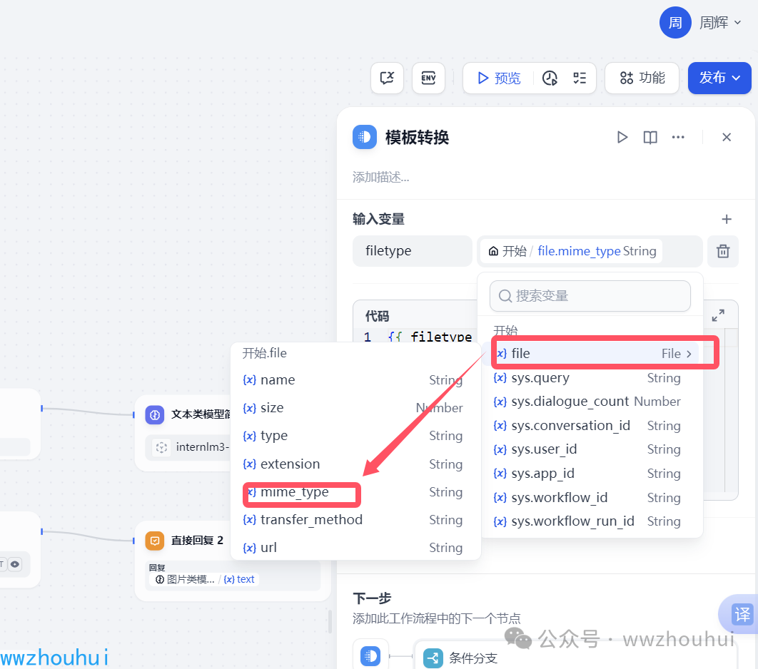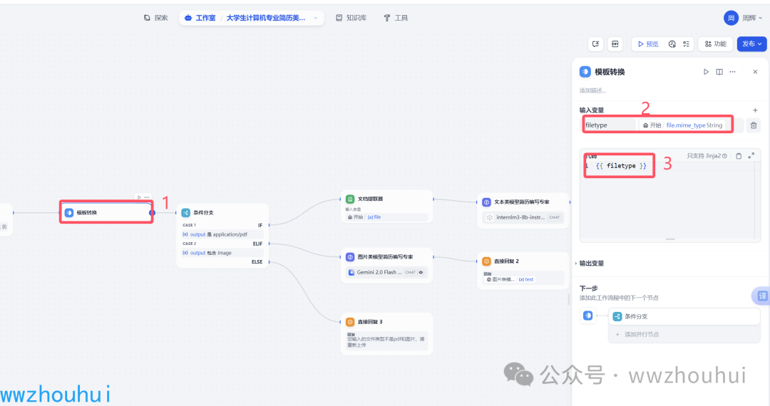 首先这个工作流由开始节点、模板转换、条件分支、文档提取器、文本类大模型、多模态大模型、直接回复等组成。