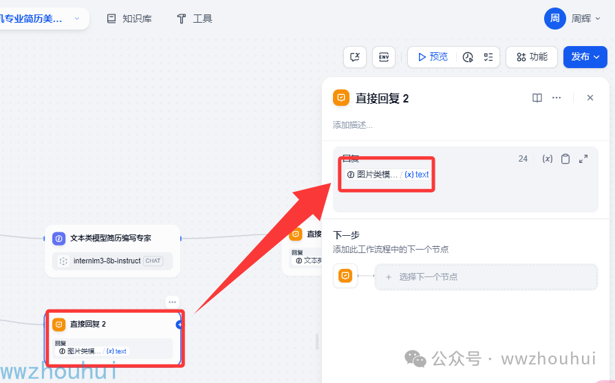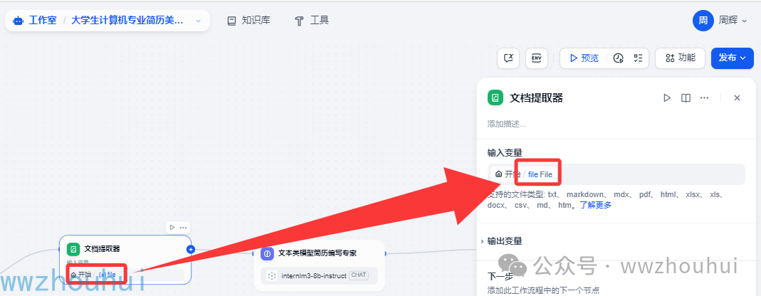 这个地方其实就是获取文档提取器里面的内容对PDF文件的内容利用大语言模型来实现简历优化和改进,这里我们用到我们选择书生浦语internlm3-8b-instruct 模型。