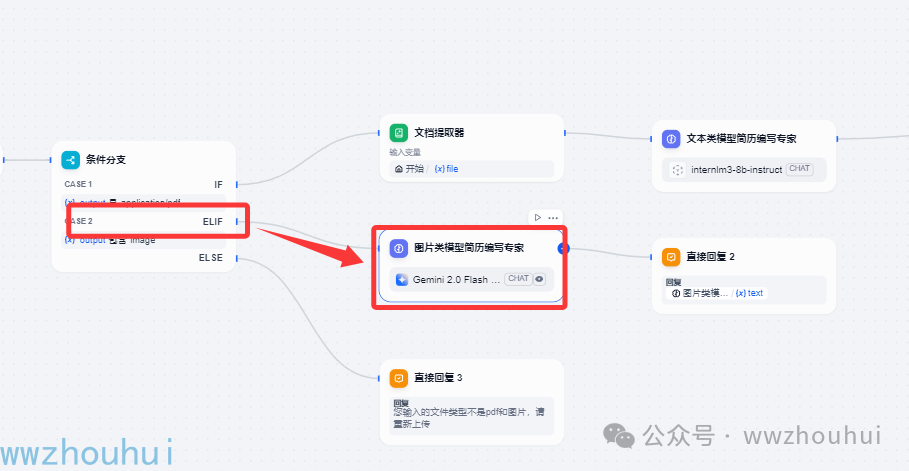 这个地方我们上节if 条件分支,我们使用多模态模型,这里我们为了速度快我们使用了 google gemini2 flash EXP 的模型(支持多模型模型)