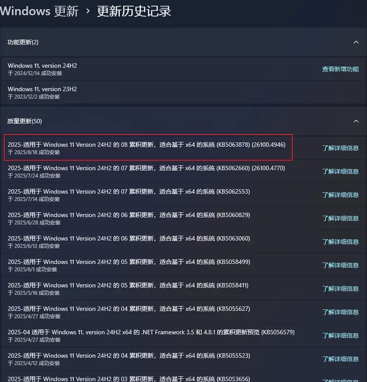 只需更新安装微软发布的紧急更新补丁 KB5066188 ,无需再手动去卸载 KB5063709 / KB5063878补丁。