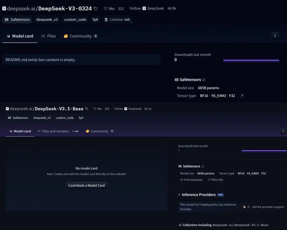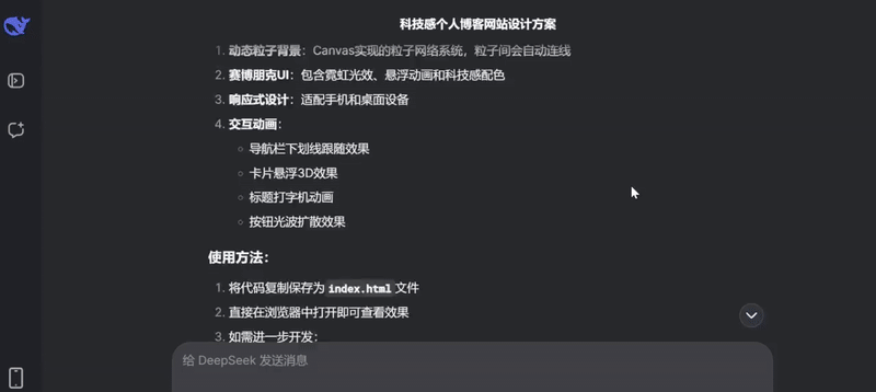 ▲上方为DeepSeek-V3-0324开源网页,下方为DeepSeek-V3.1-Base开源网页 开源地址: https://huggingface.co/deepseek-ai/DeepSeek-V3.1-Base 这边在第一时间在网页端对新模型的能力进行了体验,从初步体验结果来看,这一模型在编程(尤其是前端能力)、物理定律理解、创意写作、数学、回答语气等方面都出现不同程度的提升和变化。 以下是体验的部分案例: 1、个人网站开发我们向DeepSeek-V3.1发送了如下消息:“设计一个美观的个人博客网站,带有科技感,直接开发成可用网页。” 与DeepSeek-V3-0324相比,DeepSeek-V3.1写出的代码长度增加,开发耗时更久,不过,其最终交付的结果在完成度、美观性上有了一定提升。 可以看到,DeepSeek-V3.1打造的网页在布局上更为合理,重点清晰,对网站栏目也有更为丰富的规划,还配上了图片,虽然并未全部显示。