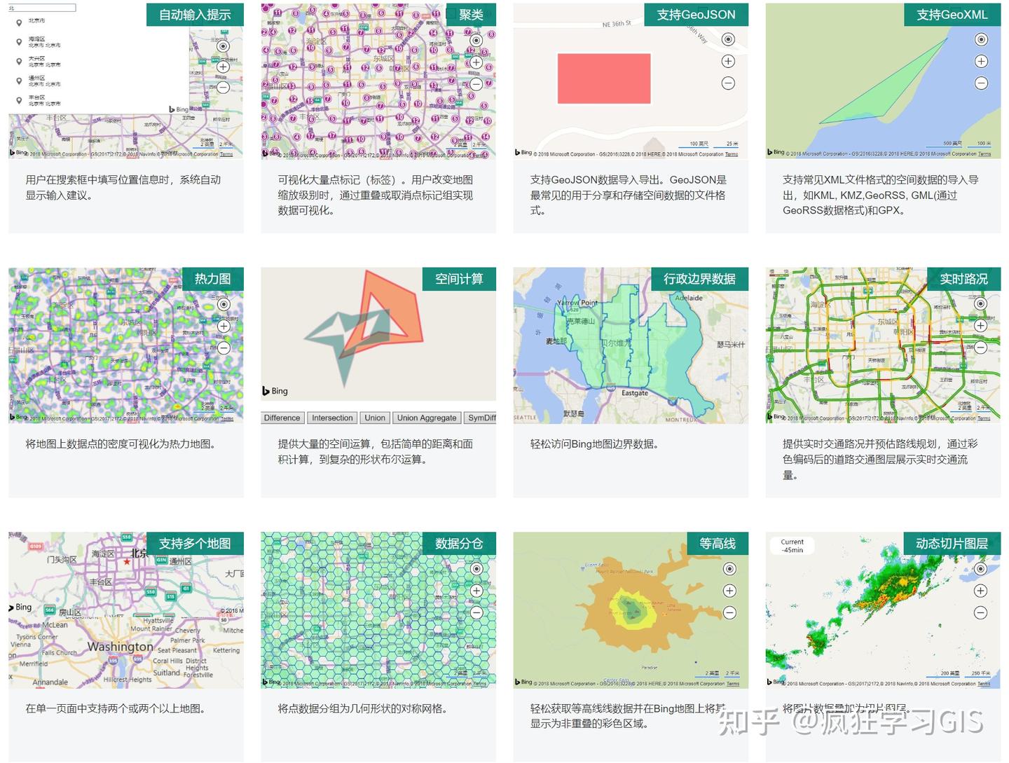 必应地图API我个人感觉其重心是在地图数据分析上。其官网并没有对定位、导航等基础地图应用需求有过多介绍,反而是对热力图、空间计算、聚类等空间分析算法加以一定篇幅的表述。对于需要涉及空间分析、地图数据计算等的应用需求,基于其API或许整体相对较为理想。