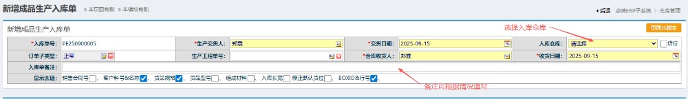 2.进入界面后,按图操作:选择好对应入库仓库备注可根据情况填写。