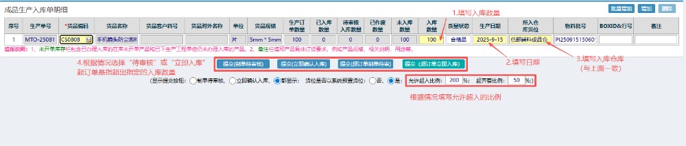 根据情况选择“待审核”或者“立即入库”。如果有超入的情况下,需要设置好超入的比例