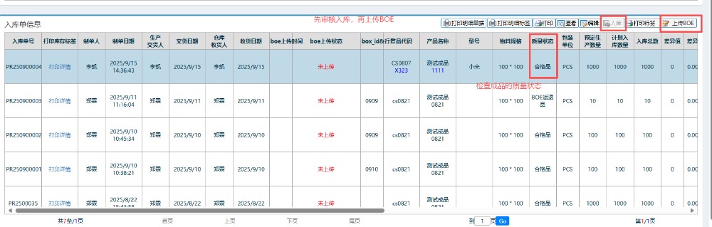 7.接下来就是进行入库的操作:先入库,再上传BOE。同时检查下成品的质量状态