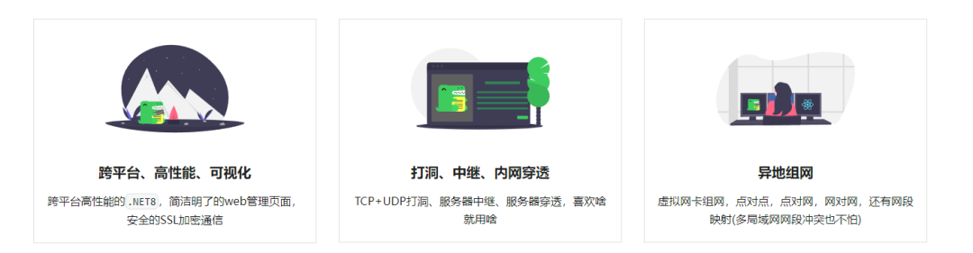 - 异地组网: 使用虚拟网卡,支持点对点、点对网、网对网、自动分配虚拟IP。