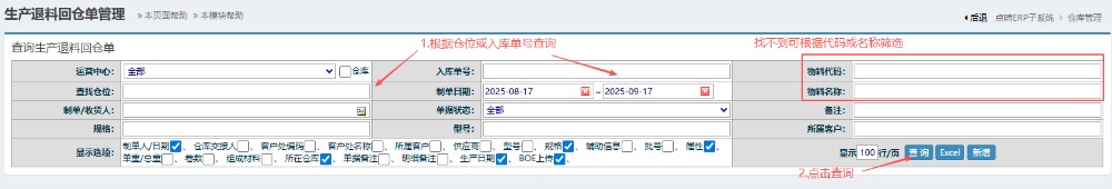 5.提交后,回到左侧的功能菜单找到“生产退料回仓单入库”。 6.进入界面后,按图操作:根据入库单号或者仓位查询,如果都找不到可以用代码或者名称筛选,然后点击查询。