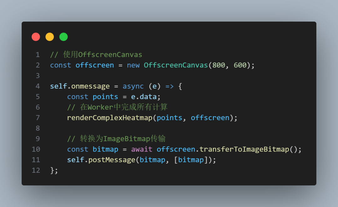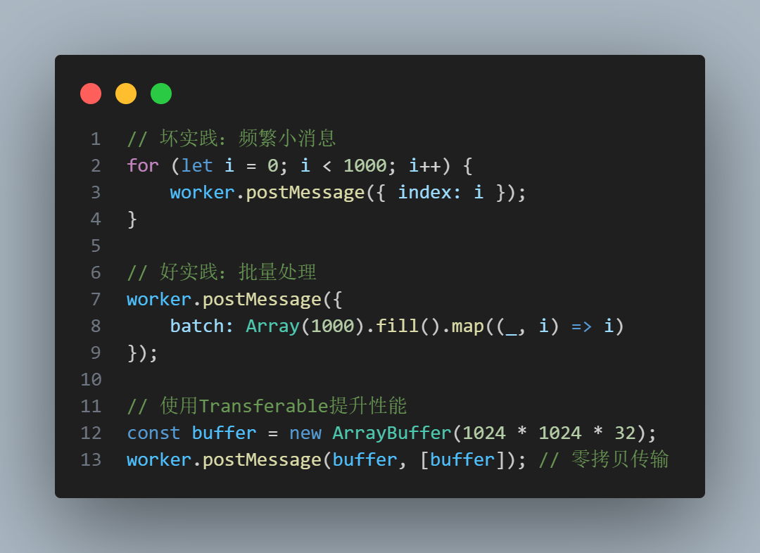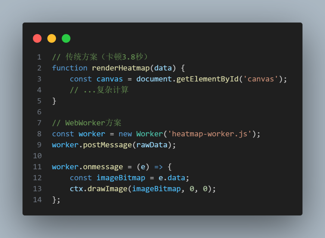 2.2 创建Worker的正确姿势主线程代码: ![]() worker.js代码: ![]() 2.3 性能对比实验结论: 虽然总耗时相近,但 WebWorker 将主线程阻塞时间降低了 99.8%! 三、实战:三个必须掌握的优化场景3.1 场景一:大数据可视化需求: 渲染10万条数据的热力图 ![]() heatmap-worker.js核心: ![]() 3.2 场景二:实时音视频处理WebRTC数据流处理: ![]() 3.3 场景三:复杂状态管理Redux性能优化方案: ![]() 四、高级技巧:Worker使用军规4.1 Worker线程的"三不原则"