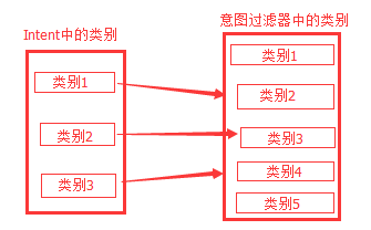 例如:Intent中有3个类别,而意图过滤器中定义了5个,如果Intent中的3个类别都与过滤器中的匹配,那么过滤器中的另外2个,将不会导致类别测试失败。