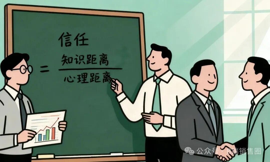 所以,做销售我们最该先解决的,不是“怎么把产品讲清楚”,而是怎么让客户敢于把心交给你。 二、信任公式:知识距离 ÷ 心理距离有人曾提出一个公式,我特别认同: 信任 = 知识距离 ÷ 心理距离 心理距离越小,知识距离越大,信任感越强。