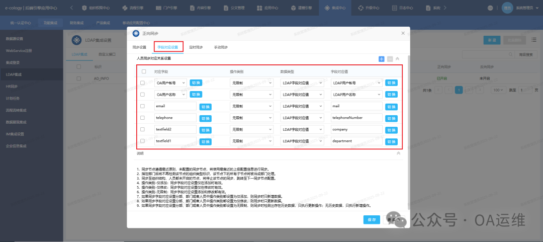 配置字段参数,左右一栏是【对应字段】是oa中的字段,右边字段【字段对应值】则是AD预控中的字段