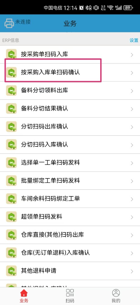 8.进入到打印预览页面后,在手机打开“点晴业务通app”,点击“按采购入库单扫码确认”