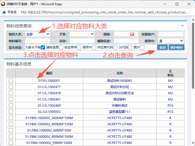 在弹窗物料信息界面内,按图操作:选择对应物料大类,点击查询。然后点击选择对应物料。