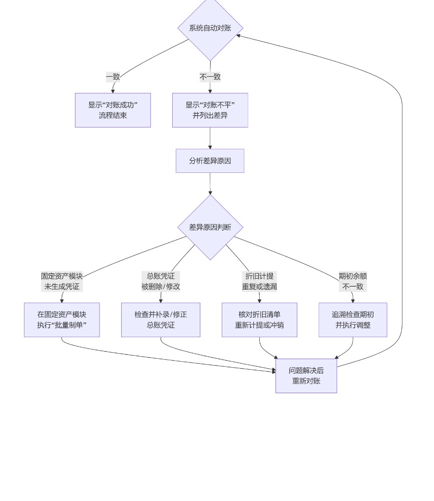 为结账提供依据: 在月末或年末结账前,完成固定资产与总账的对账是必须的步骤,确保当期核算正确无误。